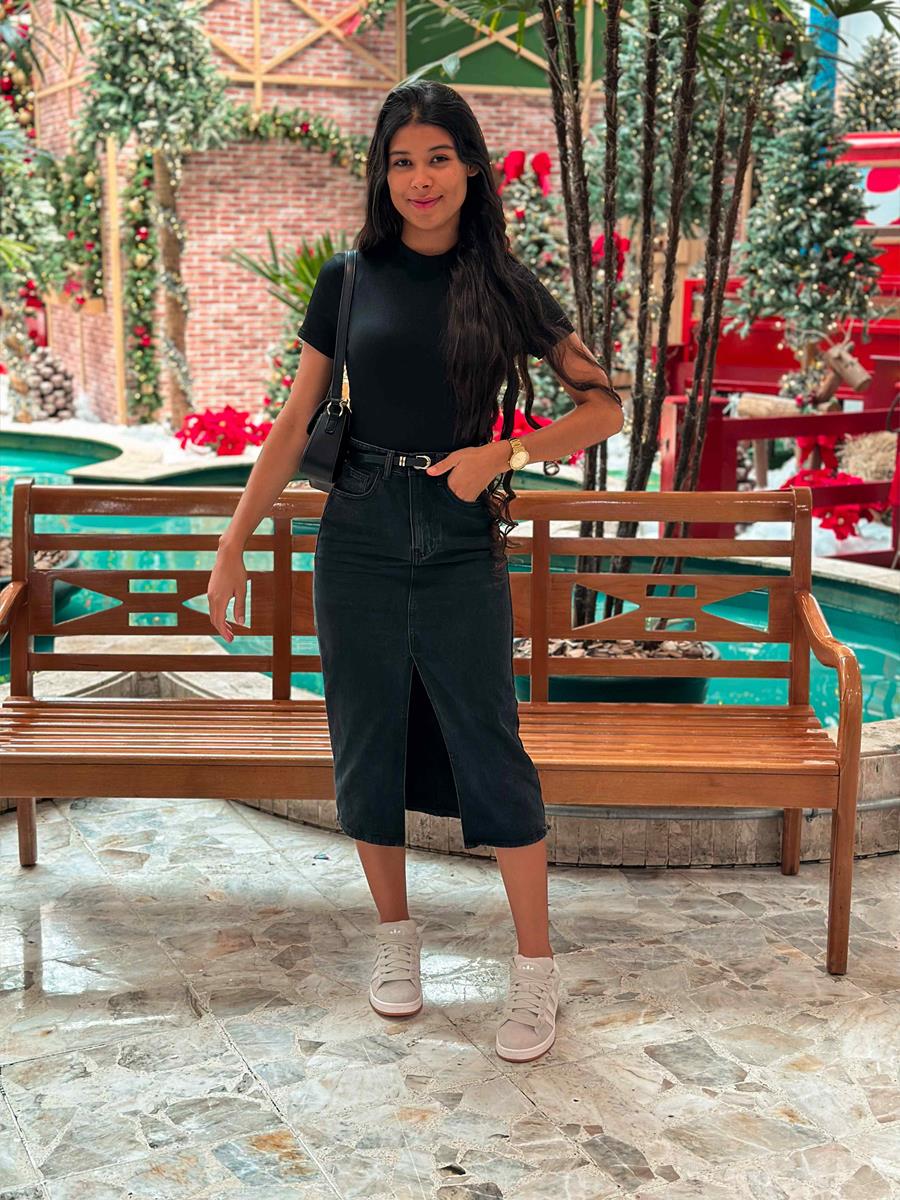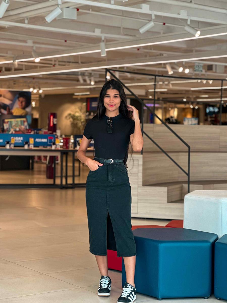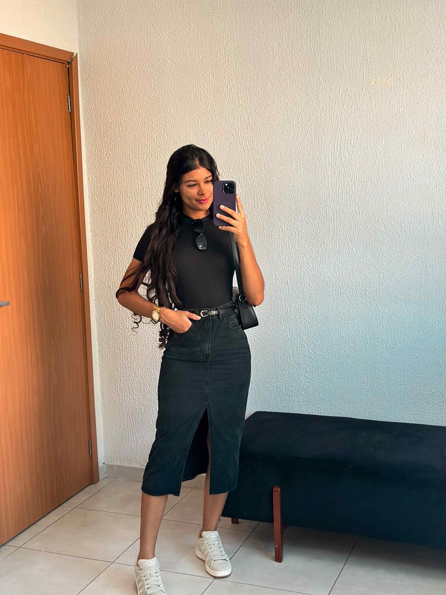 A modelo tem 1,68 de altura e está com uma 36