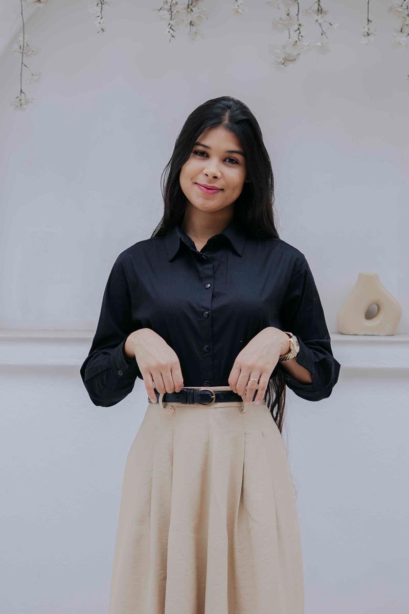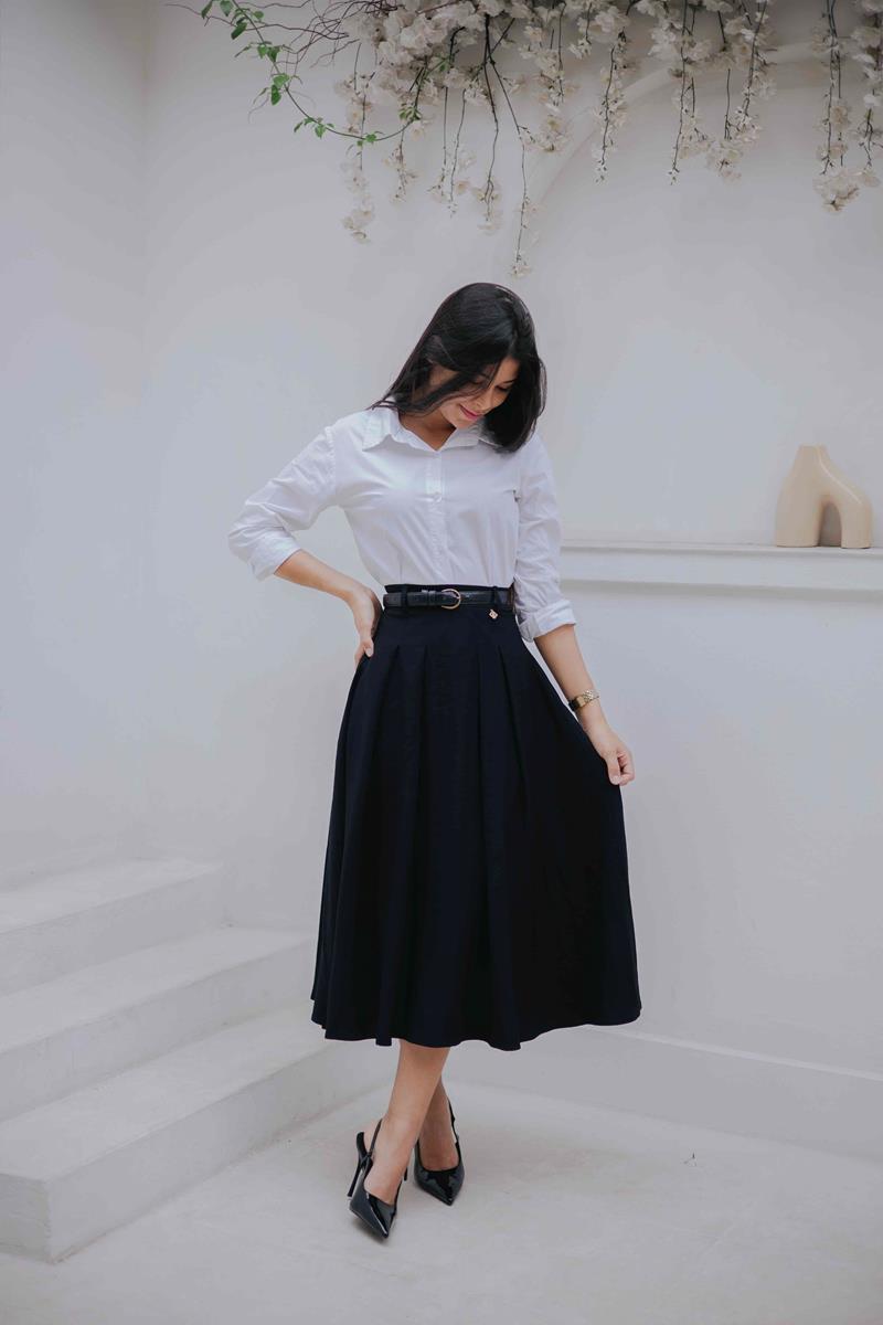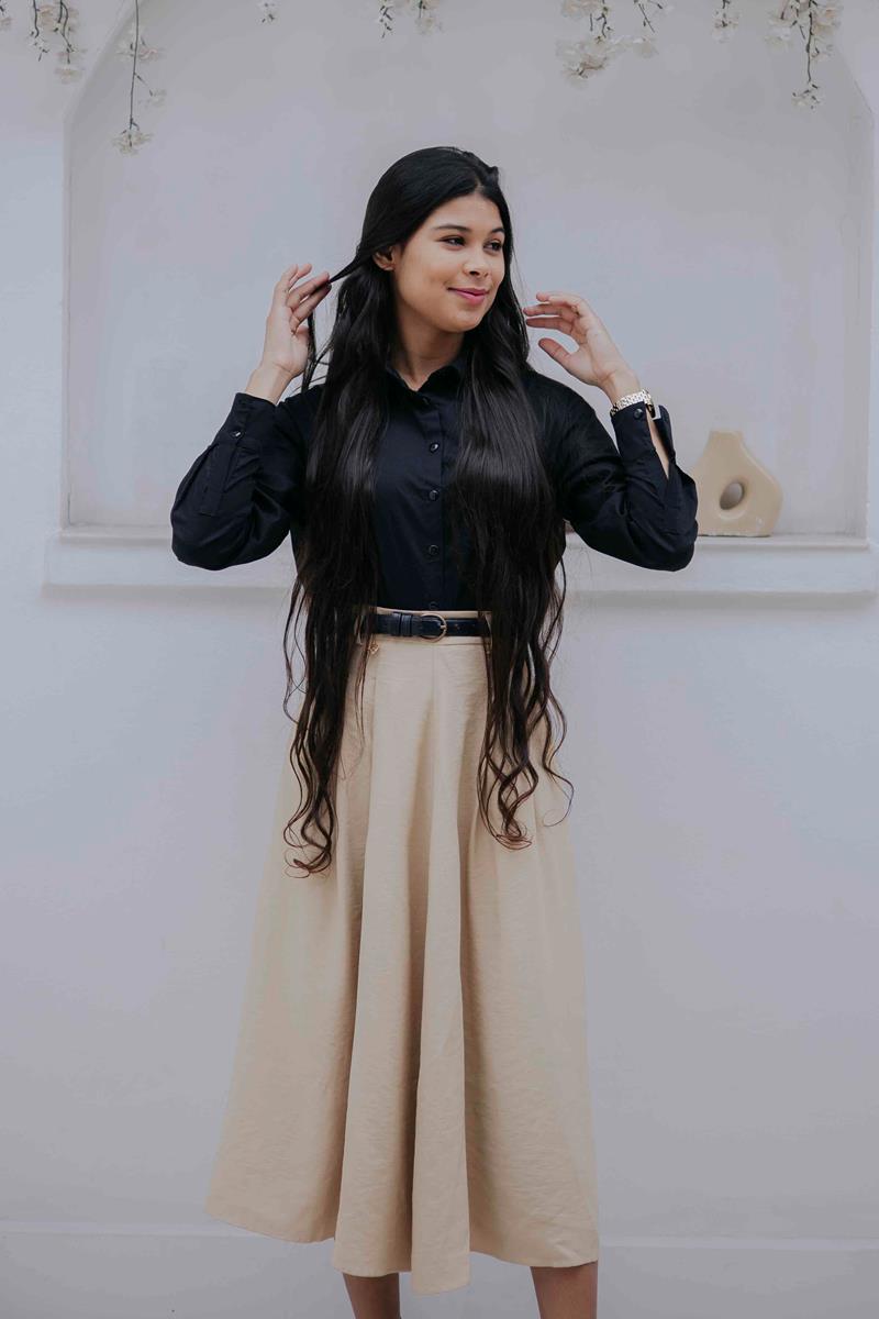 • Comprimento midi clássico, ideal para composições elegantes e modestas.