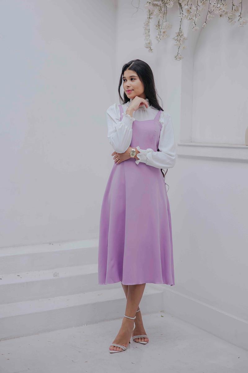 • Design: Vestido estilo jumper com corte reto e delicado, ideal para sobreposição. Acompanha blusa branca de manga longa com gola alta e babados, trazendo um toque clássico e romântico à composição.