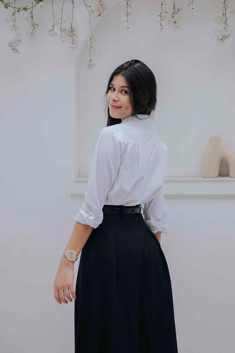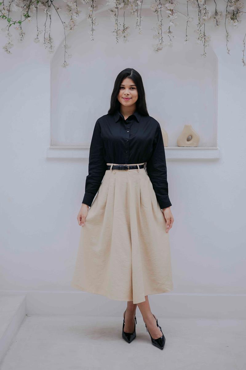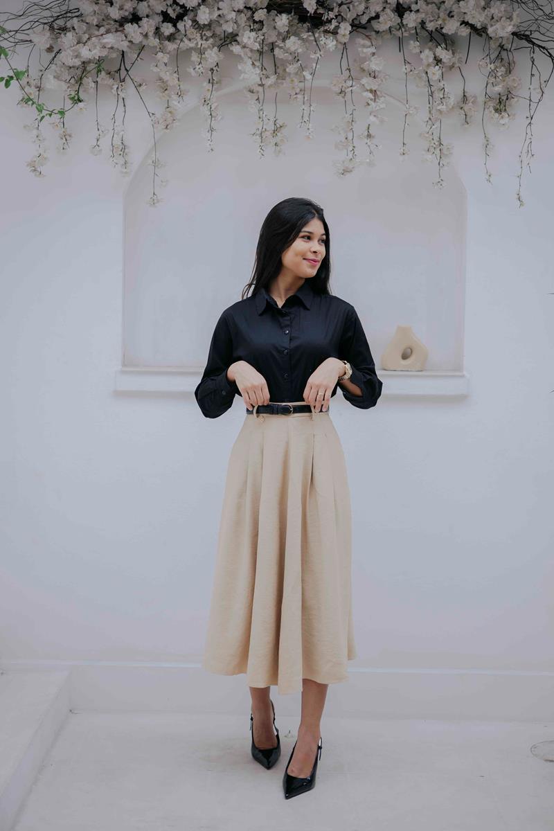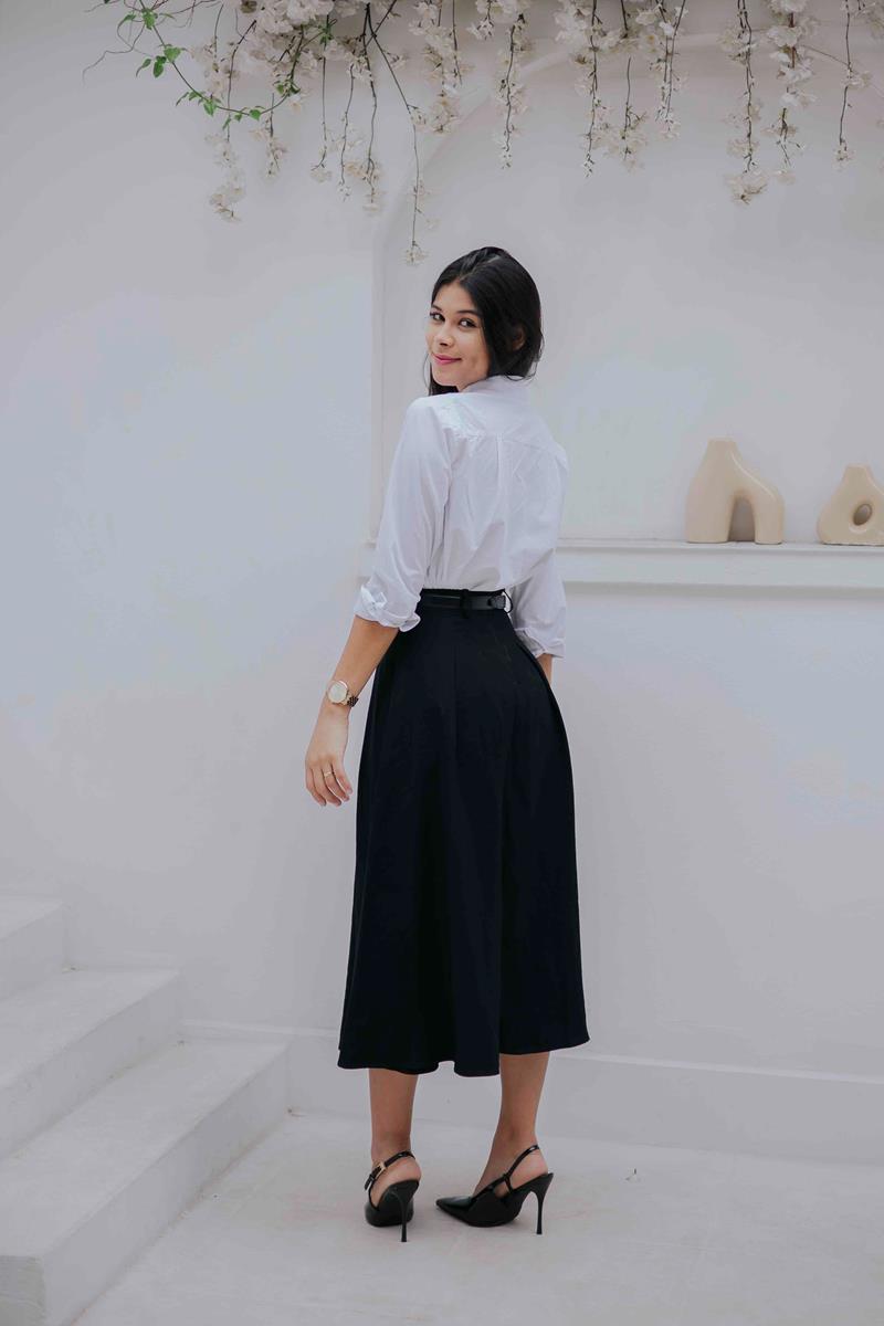 • Comprimento midi clássico, ideal para composições elegantes e modestas.